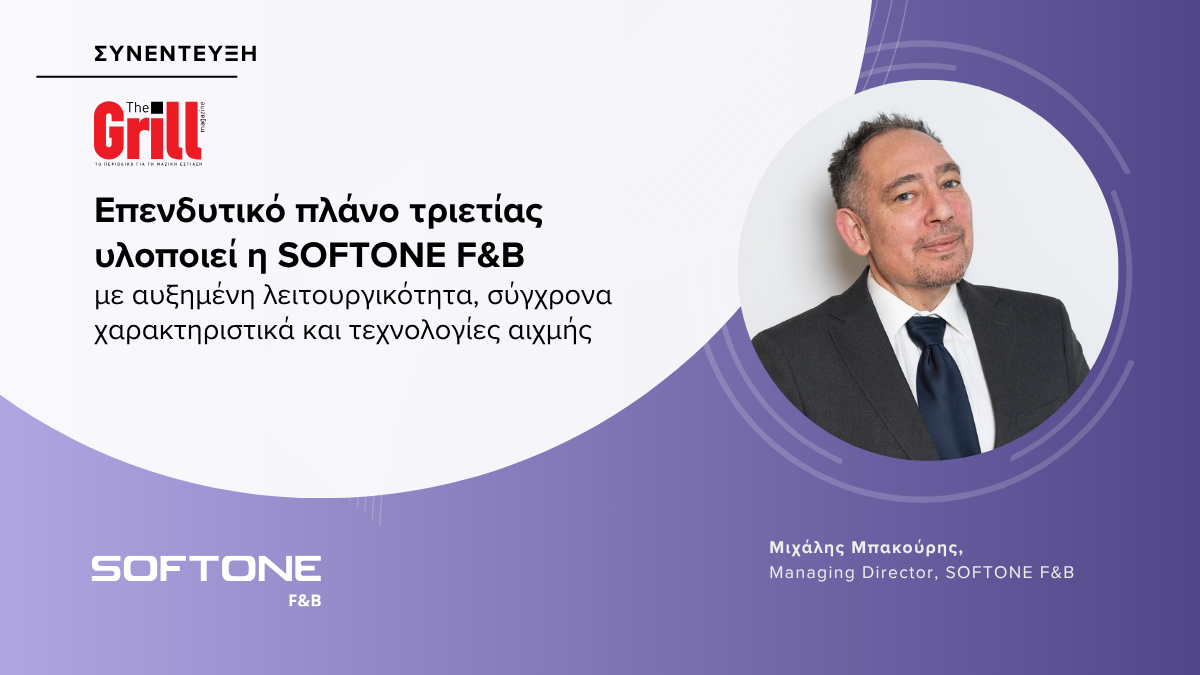 Το Grill συνομιλεί με τον Μιχάλη Μπακούρη, Managing Director της SOFTONE F&B για την πορεία της εταιρείας στο σύγχρονο επιχειρηματικό γίγνεσθαι αλλά και τις εξειδικευμένες λύσεις που μπορεί να προσφέρει με μια αγορά που αλλάζει συνεχώς μέσα από τον ψηφιακό μετασχηματισμό.